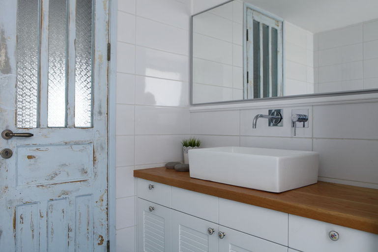 We wished to incorporate her love for art ,her unique collection of Michail Grobman paintings and her vintage collection originating from the local flea market in the design. To achieve that we designed a contemporary space and chose a monochromatic color palette that provides a clean background for the eclectic and vibrant collections of art and furniture.